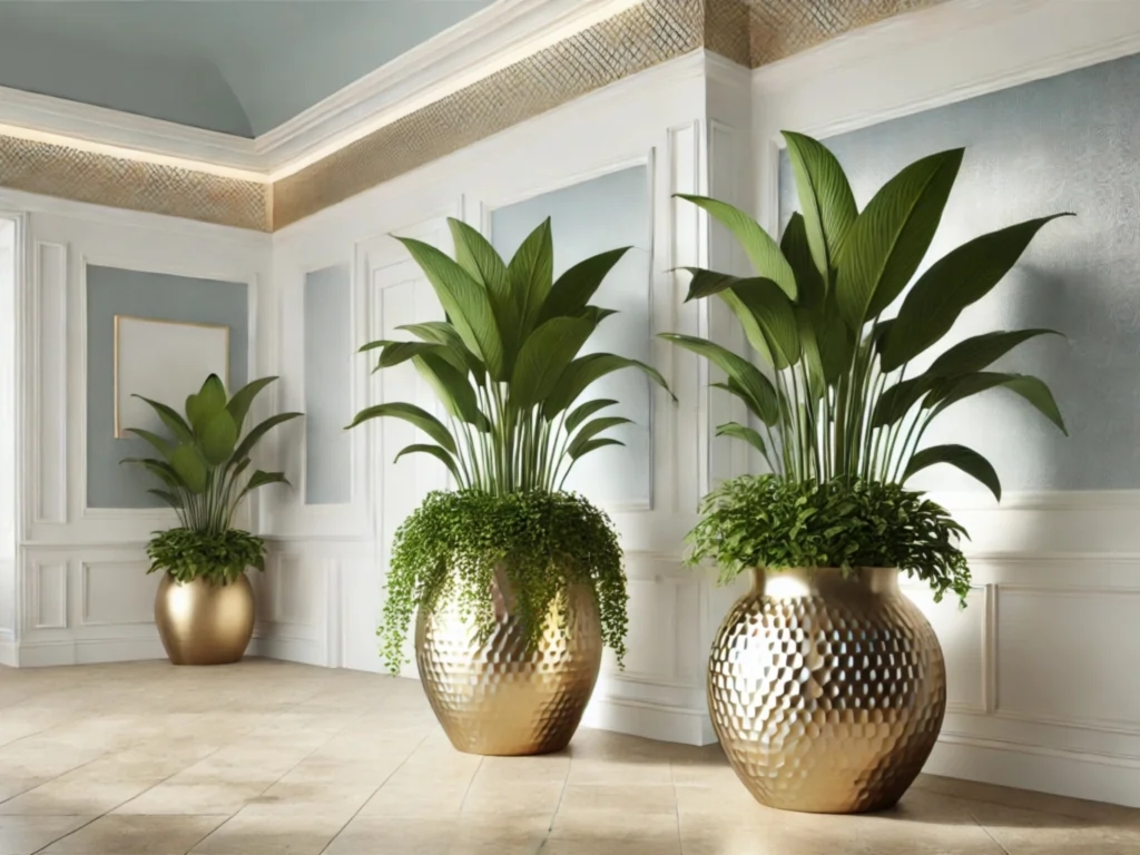 گلدانهای بزرگ فلزی با آبکاری طلایی یکی از جذابترین انتخابها برای دکوراسیون داخلی مدرن و لوکس هستند. این گلدانها با سطح براق و طلایی خود، جلوهای مجلل و باشکوه به فضا میبخشند و میتوانند به عنوان یک قطعه دکوراتیو برجسته در محیطهای مختلف مانند سالنهای پذیرایی، لابیها و فضاهای تجاری مورد استفاده قرار گیرند. استفاده از این گلدانها در کنار مبلمانهای مدرن و لوکس میتواند به ایجاد یک هماهنگی بینظیر و افزایش زیبایی فضا کمک کند.