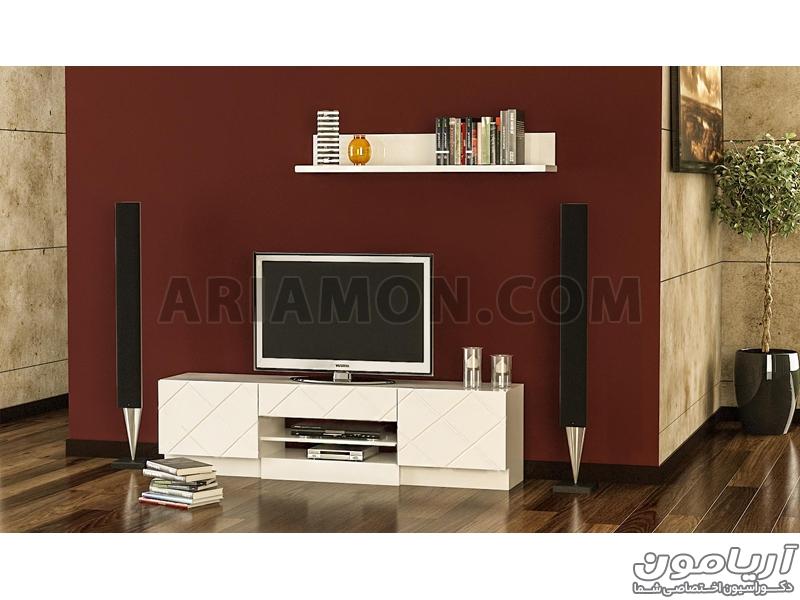 این میز تلویزیون دارای دو طبقه برای فضای رسیور، دو کمد در طرفین و یک کشو در وسط محصول.