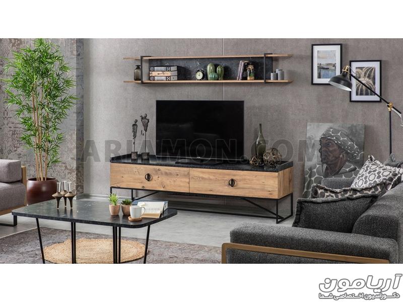 یک شلف دیواری افقی TS163 نیز در بالای میز قرار داده شده که از جنس فلز میز است. دیواره پشتی شلف با ام دی اف تمام ترکیهای و طرح سنگ مرمر سیاه طراحی شده است، و هماهنگی فوقالعادهای بین رنگ چوب روشن و فلز سیاه ایجاد میکند.
